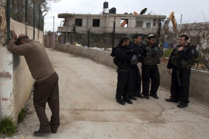 A Palestinian man reacts near Israeli security forces after Israeli bulldozers demolished his family house in the Arab east Jerusalem neighborhood of Beit Hanina on February 5, 2013. Palestinian homes built without a construction permit are often demolished by order of the Jerusalem municipality. AFP PHOTO/AHMAD GHARABLI (Photo credit should read AHMAD GHARABLI/AFP/Getty Images)