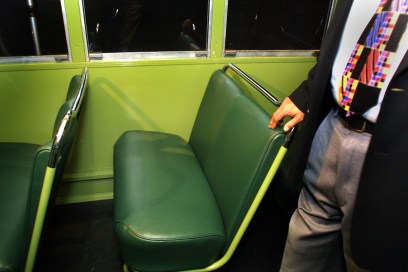 DEARBORN, MI – JANUARY 31: A man points out the seat that Rosa Parks refused to give up to a white man, beginning the civil rights movement, January 31, 2003 at the Henry Ford Museum in Dearborn, Michigan. The bus, once-decrepit after sitting in a Montgomery field for thirty years, underwent five-months of restoration to refurbish the vehicle to the way it looked on December 1, 1955 when Parks made her defiant stand. (Photo by Bill Pugliano/Getty Images)