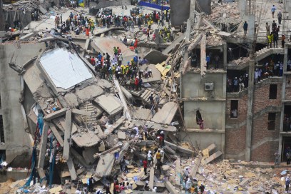 Bangladeshi volunteers and rescue workers assist in rescue operations after an eight-storey building collapsed in Savar, on the outskirts of Dhaka, on April 25, 2013. Survivors cried out to rescuers April 25 from the rubble of a block of garment factories in Bangladesh that collapsed killing 175 people, sparking criticism of their Western clients. AFP PHOTO/Munir uz ZAMAN (Photo credit should read MUNIR UZ ZAMAN/AFP/Getty Images)