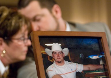 Mike and Kim Bowman, of Forreston, Illinois, whisper behind a photo of their son, Specialist Tim Bowman, U.S. Army, Illinois National Guard, Bravo Troop, 106th Calvary, as they prepare to testify during the House Veterans Affairs Committee hearing on “Stopping Suicides: Mental Health Challenges Within the Department of Veterans Affairs (VA),” on Wednesday, Dec. 12, 2007. Their son shot himself after returning form duty in Iraq.