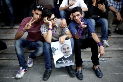 Iranians supporters of moderate presidential candidate, Hassan Rowhani flash the sign of victory holding a portrait of him as they wait for the final results outside his campaign headquarter in downtown Tehran on June 15, 2013. Rowhani has a clear lead in Iran’s presidential election, garnering 51 percent of the vote at 65 percent of polling stations across the country, the interior ministry said. AFP PHOTO/BEHROUZ MEHRI (Photo credit should read BEHROUZ MEHRI/AFP/Getty Images)
