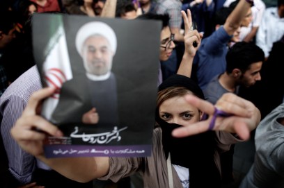An Iranian woman flashes the sign for victory as she holds a portrait of moderate presidential candidate Hassan Rowhani during celebrations for his victory in the Islamic Republic’s presidential elections in downtown Tehran on June 15, 2013. Iranian Interior Minister Mohammad Mostafa Najjar said Rowhani won outright with 18.6 million votes, or 50.68 percent. AFP PHOTO/BEHROUZ MEHRI (Photo credit should read BEHROUZ MEHRI/AFP/Getty Images)