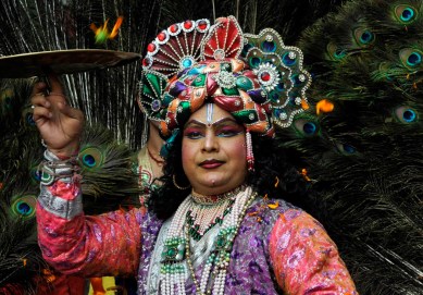 JAMMU, INDIA – AUGUST 27: Hindu devotees enacting Lord Krishna’s life during a Janamashtami procession on August 27, 2013 in Jammu, India. Janmashtami, is an annual commemoration of the birth of the Hindu deity Krishna, the eighth avatar of Vishnu. (Photo by nitin Kanotra/Hindustan times via Getty Images)