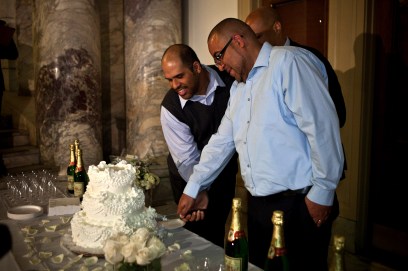 NEWARK, NJ – OCTOBER 21: Alexander Padilla and Anthony Arenas cut a piece of cake after being married by U.S. Senator-elect Cory Booker at City Hall in the early morning hours of October 21, 2013 in Newark, New Jersey. Same-sex couples were allowed to legally wed at 12:01 am on Monday across New Jersey, making the state the 14th to allow same-sex marriages. Following Friday’s ruling by the New Jersey Supreme Court, Mayor Cory A. Booker will marry seven gay, lesbian, and straight couples at City Hall in Newark on Monday morning. (Photo by Kena Betancur/Getty Images)