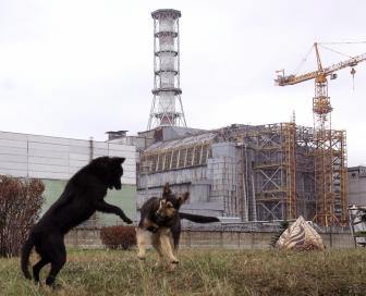 Chernobyl, UKRAINE: Stray dogs play in front of the Chernobyl nuclear power plant during a drill organized by Ukraine’s Emergency Ministry, 08 November, 2006. Emloyees and rescue workers improved their activity in case the “sarcophagus” covering the destroyed 4th power block collapses. AFP PHOTO / SERGEI SUPINSKY (Photo credit should read SERGEI SUPINSKY/AFP/Getty Images)