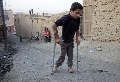 KABUL, AFGHANISTAN – SEPTEMBER 25: Fawad Rahmani ,11, makes his way home using his crutches and special braces from the ICRC September 25, 2009 in Kabul, Afghanistan. Fawad has had polio since he was 2 years old struggling up the hill to his small home. Health care is one of many problems facing Afghanistan even eight years after a war began to oust theTaliban regime along with billions of dollar in international aid. Afghanistan is still fighting to eradicate polio, one of the few countries still dealing with the disease. Earlier this month UNICEF launched an immunisation campaign targeting 1.2 million children, its aim is to immunise every child under five. (Photo by Paula Bronstein/Getty Images)