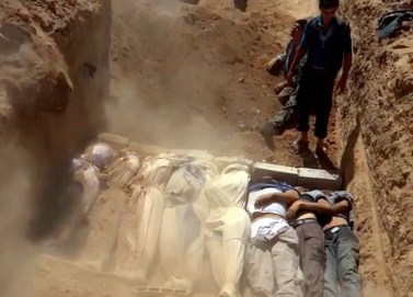 An image grab taken from a video uploaded on YouTube by the Local Committee of Arbeen on August 21, 2013 allegedly shows Syrians covering a mass grave containing bodies of victims that Syrian rebels claim were killed in a toxic gas attack by pro-government forces in eastern Ghouta and Zamalka, on the outskirts of Damascus. The allegation of chemical weapons being used in the heavily-populated areas came on the second day of a mission to Syria by UN inspectors, but the claim, which could not be independently verified, was vehemently denied by the Syrian authorities, who said it was intended to hinder the mission of UN chemical weapons inspectors. AFP PHOTO / YOUTUBE / LOCAL COMMITTEE OF ARBEEN== RESTRICTED TO EDITORIAL USE – MANDATORY CREDIT “AFP PHOTO / YOUTUBE / LOCAL COMMITTEE OF ARBEEN” – NO MARKETING NO ADVERTISING CAMPAIGNS – DISTRIBUTED AS A SERVICE TO CLIENTS – AFP IS USING PICTURES FROM ALTERNATIVE SOURCES AS IT WAS NOT AUTHORISED TO COVER THIS EVENT, THEREFORE IT IS NOT RESPONSIBLE FOR ANY DIGITAL ALTERATIONS TO THE PICTURE’S EDITORIAL CONTENT, DATE AND LOCATION WHICH CANNOT BE INDEPENDENTLY VERIFIED == (Photo credit should read DSK/AFP/Getty Images)