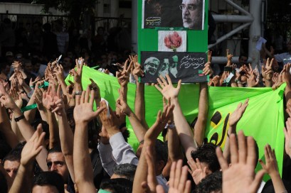 Demonstrators hold posters of Mir Hossein Mousavi, the defeated presidential candidate, clapping their hands up in the air, while marching towards Azadi square, Tehran. Thousands of people took to the streets, on days that followed, after the disputed presidential election results which Mahmoud Ahmadinejad was elected as president for the second term in office. They claimed that their votes to reformist candidates Mir Hossein Mousavi and Mehdi Karoubi had not been counted. (Photo by Kaveh Kazemi/ Getty Images)
