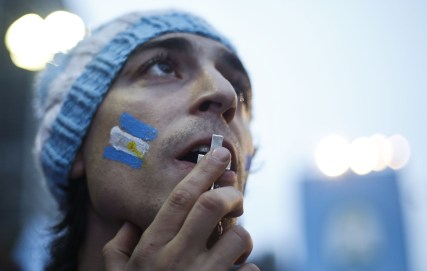 A supporter of Argentina watches the FIFA World Cup Brazil 2014 semi-final football match between the Netherlands and Argentina at the FIFA Fan Fest public viewing event in Sao Paulo, Brazil on July 09, 2014. AFP PHOTO/Miguel SCHINCARIOL (Photo credit should read Miguel Schincariol/AFP/Getty Images)