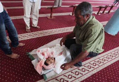 GAZA CITY, GAZA – JULY 10: A Palestinian man sits next to the body of five-year-old Abdallah Abu Ghazal killed in an Israeli air strike, during his funeral at a mosque in Beit Lahiya, in the northern Gaza Strip, on July 10, 2014. The total number of Palestinians killed by Israeli airstrikes in the Gaza Strip since Monday night has risen to 86, including 25 children, the Palestinian Health Ministry said Thursday. (Photo by Ashraf Amra/Anadolu Agency/Getty Images)