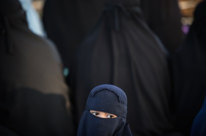 GOWA, SULAWESI, INDONESIA – JULY 27: A girl from an Islamic commune An-Nadzir looks on during Eid Al Fitr mass prayer at Mawang Lake on July 27, 2014 in Gowa, South Sulawesi, Indonesia. Exclusive Islamic community An-Nadzir has 5,000-10,000 followers across Indonesia, one of world’s largest Muslim nation. Their beliefs are the same as mainstream Muslims, but there are some differences in prayer timings and fast breaking methods. They pray before breaking their fast unlike other Muslims who do the opposite. The men dressing in dark robes and colour their hair while women are draped in head-to-toe burqas. In the remote area in Gowa district, the community live a basic life of farming and fishing, condemn militancy of any kind, and believe in salvation without discrimination and living in peace with others. By carrying out a manual calculation based on ru’yat (lunar sighting) and observations on several signs of nature, the An Nadzir muslim community decided that Eid Al Fitr 1435 H in this year fell on Sunday. (Photo by Agung Parameswara/Getty Images)