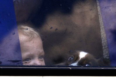 A boy and a dog look out from a bus stopped to be checked at a checkpoint on a road between Kramatorsk and Slavyansk on August 7, 2014. Fighting raged on in Ukraine’s industrial east, where local authorities have warned of a looming humanitarian catastrophe. Certain areas have been left without water or power and hundreds of thousands have already fled. NATO chief Anders Fogh Rasmussen urged Russia to “step back from the brink” during a visit to Kiev on Thursday and vowed support for Ukraine as fears mounted that Moscow was preparing to send troops into the conflict-torn east of the country. AFP PHOTO/ ANATOLII STEPANOV (Photo credit should read ANATOLII STEPANOV/AFP/Getty Images)