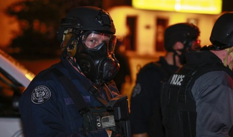 FERGUSON, UNITED STATES – AUGUST 17: Police forces intervene protesters, taking streets to protest the killing of Michael Brown although U.S. Missouri State Governor Jay Nixon Saturday declared a curfew and a state of emergency in Ferguson, a suburb of St. Louis, on August 17, 2014. Eighteen-year-old unarmed teen was shot dead by police in the St. Louis suburb of Ferguson, Missouri on August 09, 2014. (Photo by Bilgin Sasmaz/Anadolu Agency/Getty Images)