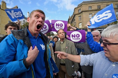 DUNDEE, SCOTLAND – AUGUST 27: Yes and Better Together supporters exchange views with one another as Jim Murphy Shadow Secretary of State for International Development (not seen), speaks on his soapbox during his ‘100 Towns in 100 Days’ tour on August 27, 2014 in Dundee, Scotland. Mr. Murphy, Labour MP, is touring Scotland on behalf of the Better Together, spreading his message about the benefits of Scotland remaining part of the union and informing the public of the risks that independence poses for the country. (Photo by Jeff J Mitchell/Getty Images)