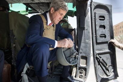 US Secretary of State John Kerry waits in a helicopter on September 10, 2014 in Baghdad. Kerry flew into Iraq today for talks with its new leaders on their role in a long-awaited new strategy against Islamic State jihadists to be unveiled by President Barack Obama. AFP PHOTO/POOL/BRENDAN SMIALOWSKI (Photo credit should read BRENDAN SMIALOWSKI/AFP/Getty Images)