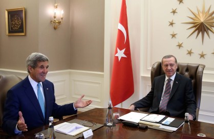 ANKARA, TURKEY – SEPTEMBER 12: U.S. Secretary of State John Kerry (L) meets Turkey’s President Recep Tayyip Erdogan (R) during Kerry’s official visit at Cankaya Palace in the capital Ankara, Turkey on September 12, 2014. (Photo by Kayhan Ozer/Anadolu Agency/Getty Images)