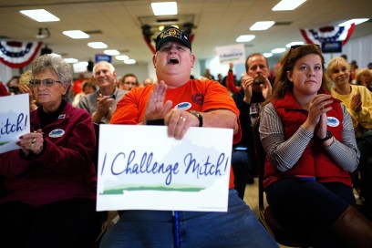BOWLING GREEN, KY – NOVEMBER 03: Supporters of Democratic Senate candidate and Kentucky Secretary of State Alison Lundergan Grimes cheer while Grimes speaks at a campaign stop at the United Auto Workers hall November 3, 2014 in Bowling Green, Kentucky. Grimes, who is running a close race with Senate Minority Leader Mitch McConnell (R-KY), is scheduled to travel to nine locations around the state today in an effort to increase voter turnout in advance of the November 4, midterm election. (Photo by Win McNamee/Getty Images)