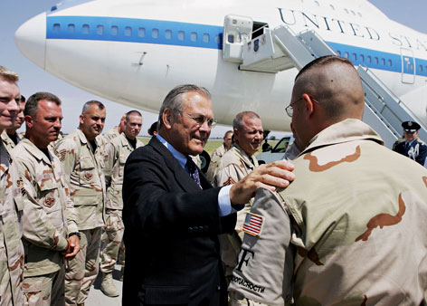 "Bush has delegated virtually all war planning and management of the military to Rumsfeld; his own relationships with uniformed military officers or other Pentagon officials appear to be neither numerous nor deep compared to those of other wartime Presidents… All I’m saying is that what the sudden departure of a man who has served as a kind of Deputy President for over four years would leave is a situation in which many decisions now finally made in Rumsfeld’s office could not be made, military leaders that have by and large allowed themselves to be run by Rumsfeld would be left to jockey amongst themselves for position and influence in his absence, and — from Bush’s point of view this factor must loom especially large — the President’s tenuous grasp both on what is happening in Iraq and what is happening in the military would be further exposed."