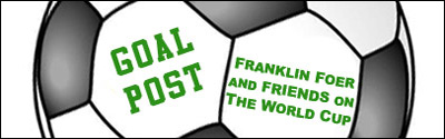 I want England to win, of course. But my longstanding policy every four years is only to watch matches after the quarter-finals, or matches where England is against Germany or and France. Especially Germany. Couldn’t give a toss about the rest. So let Frankie Foer be your guide. He cares, he scores, he gives you the impact on globalization and CO2 emissions. (Look, it’s about as butch as TNR can be. For the longest time in the back of the book, there was a very strict policy on reviewing sports books. As Leon once elegantly explained: "if there’s a ball in it, we won’t run it." But Leon doesn’t run the blogs. He just hates them.)