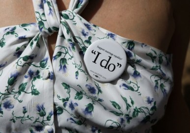 SAN FRANCISCO – MAY 15: Christmas Leubrie wears a pro same-sex marriage button on her dress as she awaits a California Supreme Court decision to overturn the ban on same-sex marriage at the California Supreme Court May 15, 2008 in San Francisco, California. The California Supreme Court voted 4-3 to overturn a ban on gay marriage in California making it the second state where gays and lesbians can marry. (Photo by Justin Sullivan/Getty Images)