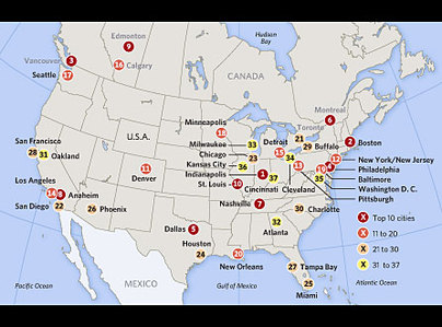 Indianapolis takes first place and Boston second (so much for the curse of the Bambino). New York is 12th, D.C. 35th, L.A. 14th, Chicago 23rd. The ranking, by the Toronto Star, calculates the winning percentages since 2000 for the 37 U.S. and Canadian cities with at least two professional sports teams.
