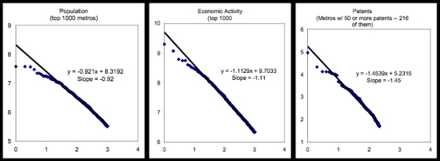 Tim Gulden of George Mason University has used data based on satellite images of the world at night to provide a Zipfian analysis for the 1000 largest urban agglomerations globally, based on several different measures of city size comparing rankings for population, economic activity, and patented innovations.