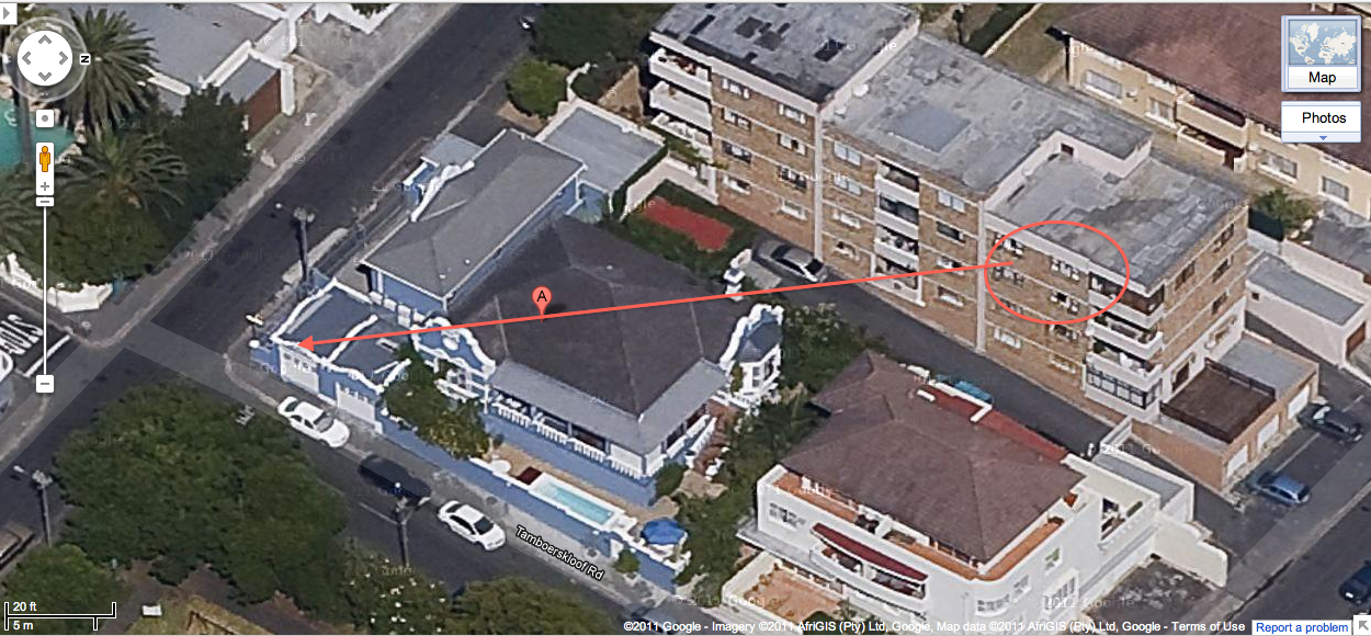 I know this one! The blue building is the lovely Table Mountain Lodge guest house on Tamberskloef Road in Cape Town, where I stayed a couple of nights to do some sightseeing in and around Cape Town after a conference in 2009. Lining up the corners of the buildings, it looks as if the view was taken from the window marked by an arrow in the adjacent apartment building, called "Bagamoya", on Brunswick Road. One of my favourite pictures from that trip: