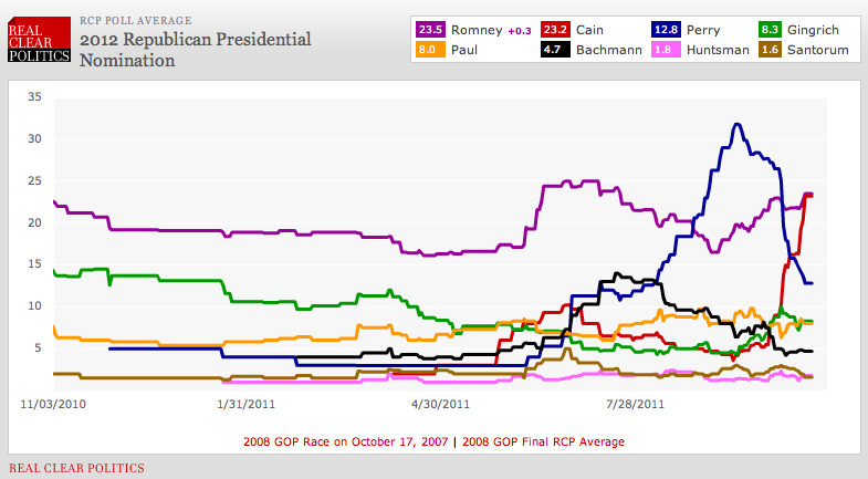 (Poll of polls, showing Cain tied with Romney, from Real Clear Politics.)