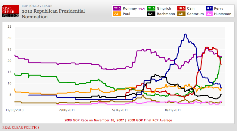 In the Vanderbilt Poll, conservatives comprised a majority of every major candidate’s supporting coalition. However, only Cain and Gingrich drew more than 80% of their support from avowed conservatives. … It is hardly surprising that Cain’s supporting coalition looks so solidly conservative. But it is a big surprise in the case of Gingrich. Remember, this is the guy who was being excoriated just six months ago for denouncing the Republican budget as “right-wing social engineering.”