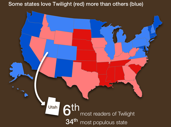 On the map above, the readers in the red states rated the book highly (the darker the red, the higher the rating), while readers in the blue states gave it a lower rating). The Midwest and the South represent The Twilight Belt, while the coasts were decidedly less impressed with the book. Reviews were mostly distributed according to population, with the notable exception of Utah. Utah is the 34th most populous state in the US, but it generates the 6th most reviews of Twilight. In terms of cities, Salt Lake City—the 125th largest city in the country—is second only to New York in number of Twilight reviews.