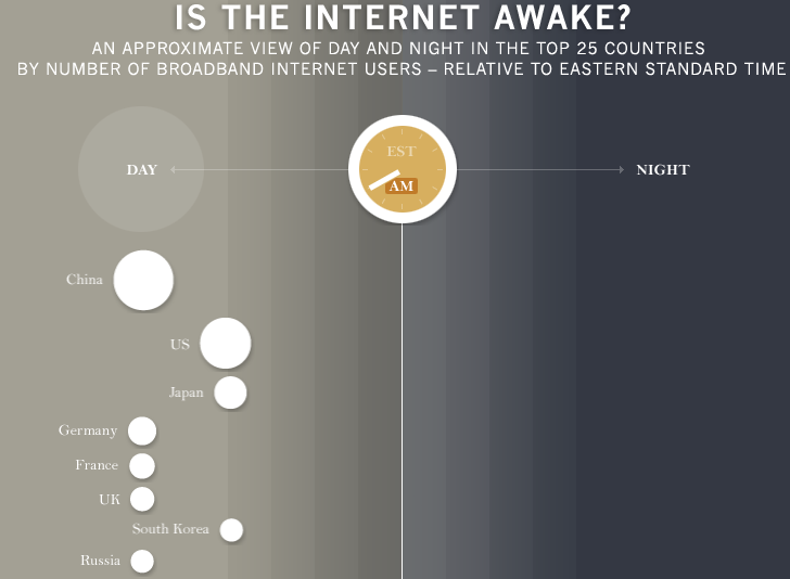 The further a circle is to the left, the more certain it is that most citizens in the country it represents are awake. The opposite is true for the right/night side. If you're wondering when to tweet your most brilliant thoughts in order to maximize International exposure, it looks like 9am EST or thereabouts is a pretty good bet!