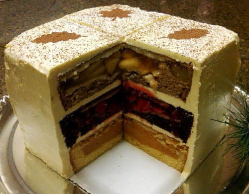 It's a triple layer cake with a pie baked into each layer. To make the bottom layer, you bake an entire apple pie inside a spice cake. The middle layer is a pumpkin pie baked inside a yellow cake. Top it off with a cherry pie baked inside of a white cake. Once finished and frosted, it's a foot tall and packs an astronomical number of calories per slice. Diabetics and health-food devotees will run screaming.