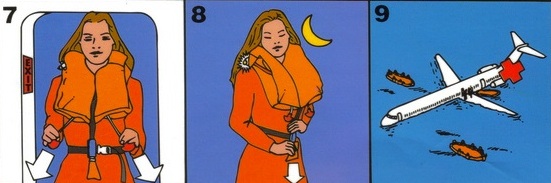 As everyone knows, the story contained in this pamphlet has little to do with anything resembling the truth. If shit goes down, if that horrifying alarm is sounded, will your fellow passengers really calmly place oxygen masks over their faces? Will that crazy lady sitting next to you inflate her life jacket in a quiet and orderly fashion? (“Put it on as you would a waistcoat,” a 1930s British Imperial Airways card advises its clientele.) In the history of aviation, has any plane ditched over the north Atlantic, leaving its passengers floating in the mountainous, frigid waves of the open ocean with serene expressions on their faces? Airline safety cards aren’t instructional guides, they are works of fantastic imagination.