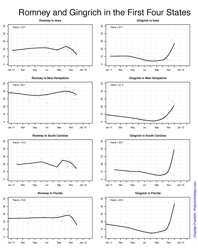 With a lot of attention focused on the collapse of the Herman Cain campaign and the sudden rise of Newt Gingrich I think we’ve missed an important downturn in Mitt Romney’s standing in the first four states. Since mid-September he has experienced significant downturns in all four states that will vote in January. Romney is down about 10 in Iowa, 5 in New Hampshire, 10 in South Carolina and 14 in Florida. His recent increase in effort in Iowa may have less to do with trying to win than with attempting to shore up weakening support there.