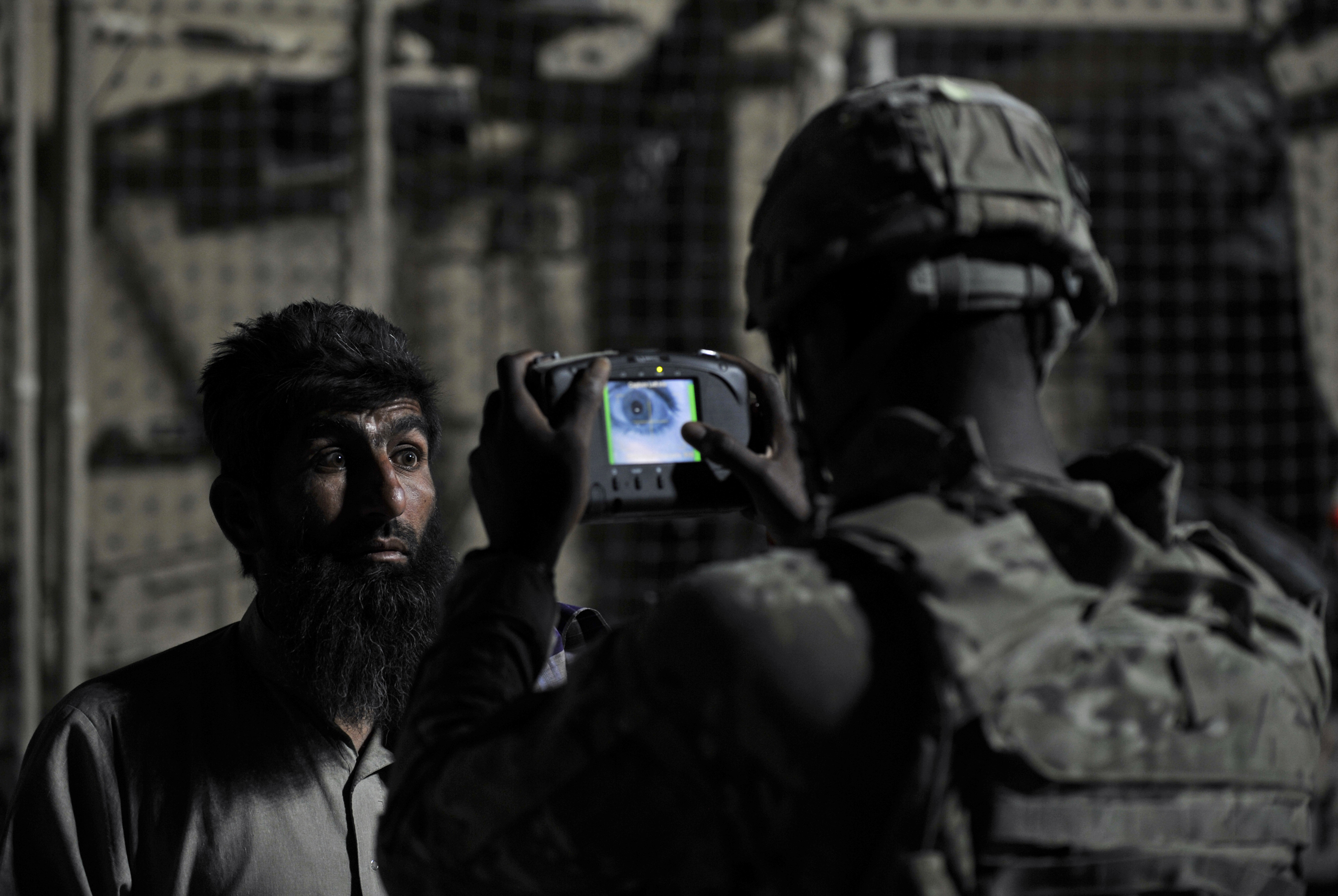 (Photo: SPC Tolbert Brandon from the US army HHB 3-7 Field Artillery Regiment 3rd Bct 25th ID scans the eyes of an Afghan man with Automated Biometric Identification System (ABIS) during a mission in Turkham Nangarhar on September 28, 2011. By Tauseef Mustafa/AFP/Getty Images)