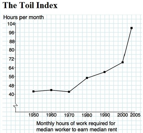 My entry is the attached graph of what I call the Toil Index. It's an index I constructed to portray the most dramatic element of the middle-class squeeze — the effort required to rent a house served by a school of average quality.