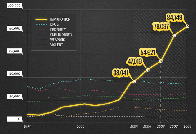 Immigration offenses were the fastest growing federal arrest offenses between 2005 and 2009, increasing at an average rate of 23 percent a year, according to statistics released by the Justice Department’s Bureau of Justice Statistics. In 2009, 84,749 people were arrested and charged with immigration offenses, up from 38,041 in 2005, the agency announced yesterday. With 46 percent of all arrests, illegal immigration was the most common offense for an arrest in 2009, followed by drug violations, accounting for 17 percent, and supervision violations, with 13 percent.