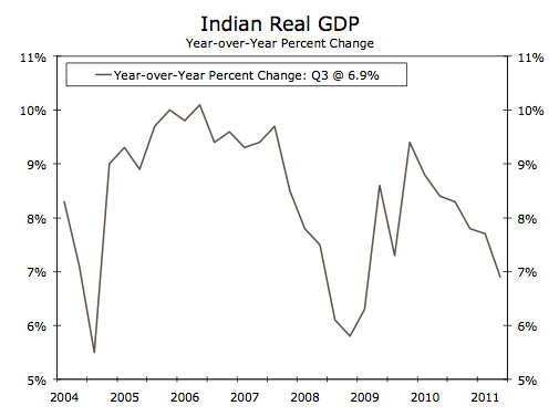 Once you get past mid-year export growth, there's not a lot of good news coming out of India. Inflation is near 10 percent, which is even worse news than it sounds, since Indian families spend as much as 30 percent of their income on inflation-sensitive food. GDP growth is down, industrial production is slowing, and investors are shirking away from Indian assets. All that means the India is inauspiciously reliant on a global economy that is feeling even more vulnerable. Twenty percent of its exports go to the EU, which is on the precipice of … well, who even knows right now. Another 20 percent go to Asian economies, many of which are experiencing their own slowdowns.