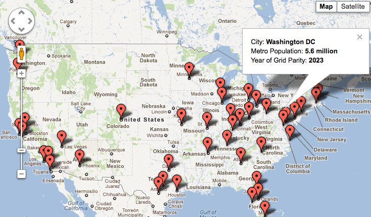 A snapshot of John Farrell's animated map of the years in which solar energy will be cheaper than grid electricity in major American cities. Farrell predicts that San Diego will be the first city to reach solar parity, in 2013. How he did the math: