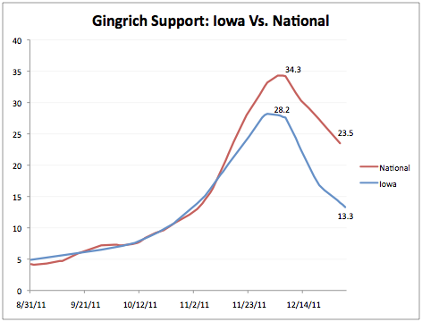 According to CMAG's Goldstein, none of the Republican candidates or their Super PACs aired advertising nationally, either on broadcast or cable television, so the national decline resulted from media coverage that echoed many of the same criticisms delivered in the paid ads in Iowa (and even some of the ads themselves).