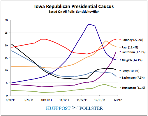 [T]hat math assumes two things that may not turn out to be true: First, that the polls are collectively free of statistical bias, and that any shortcomings in the way they identify the likely electorate are not skewing the snapshot in some meaningful way. Second, it assumes that any surges in support for a particular candidate are over and have not changed the standings over the final days of the campaign. The history of polls conducted before Iowa's caucuses says both assumptions are questionable.