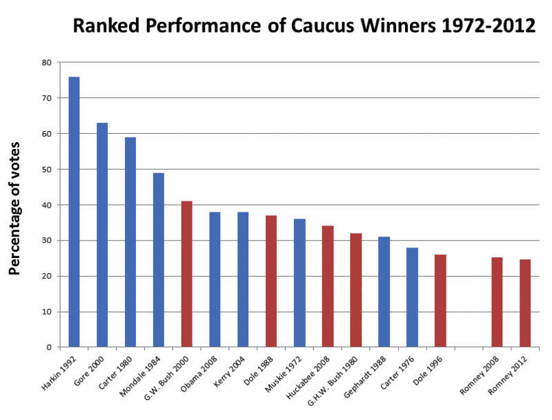 Romney “surpassed” Bob Dole to earn the distinction of having the lowest winning share of the vote in the history of the Iowa caucuses. Never has support in a political party been so tepid for its “favorite”. Romney not only set a record by being the first Iowa winner to convince more than three quarters of voters to choose someone else, but also managed to do even worse than he himself did last time around despite four intervening years of hard, expensive campaigning.