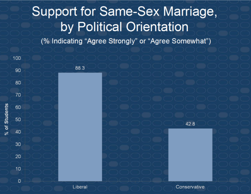 An unprecedented 71.3 percent of incoming college students indicated that same-sex couples should have the right to legal marital status, compared with 64.9 percent in 2009, a remarkable 6.4 percentage-point increase over a two-year period. While support for same-sex marriage is highest among female students and those who identify as liberal, a significant amount of conservative students (42.8 percent) and an increasing number of male students (64.1 percent in 2011 vs. 56.7 percent in 2009) expressed support for this issue.
