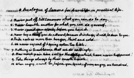 (Image: "A Decalogue of Canons for observation in practical life" by Thomas Jefferson, beginning with "Never put off till tomorrow what you can do to-day." Via Lists Of Note.)