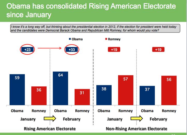 (Charts of Obama and Romney support among the "Rising American Electorate," defined as "unmarried women, young voters, and minorities," by Democracy Corps)