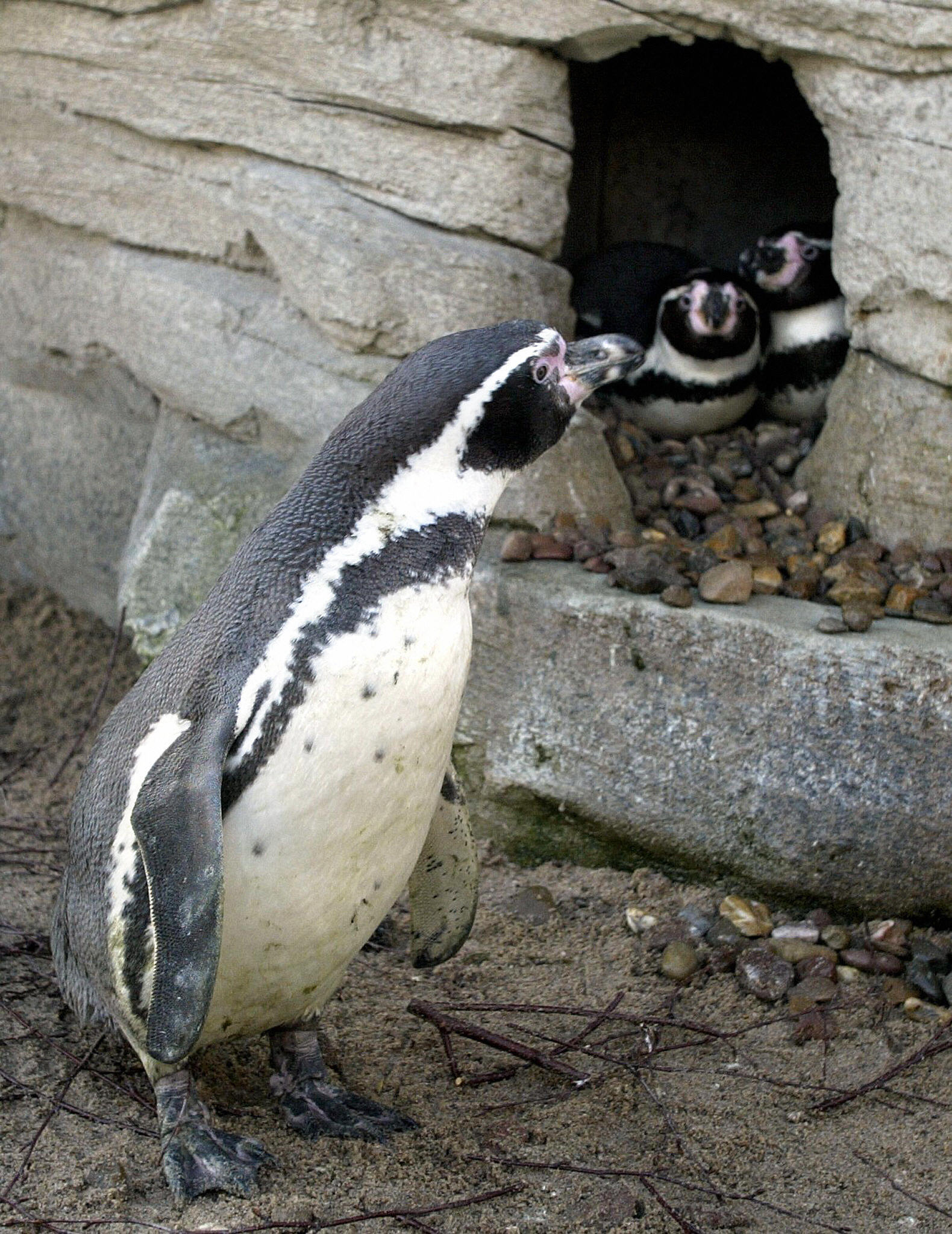(Photo: Female penguin 'Schumi' (L) watches male penguin pair 'Sechs Punkt' (Six Point) and 'Schraegstrich' (Slash) cuddling on February 11, 2005 at the Bremerhaven zoo, where three male homosexual penguin couples live. Although the zoo imported four female penguins from a Swedish zoo last January, the males still don't show any interest in them. By David Hecker /AFP /Getty Images.)