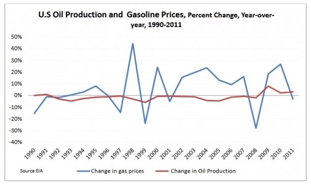 The price of gasoline bears very little relationship to U.S. oil production, for the simple reason that U.S. oil production is a small fraction of the world’s total. See any relationship? Me neither.