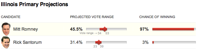 Illinois had appeared to offer Mr. Santorum a chance at a breakthrough. Instead, unless the polls are very wrong, it may represent a breakthrough of sorts for Mr. Romney – by far his biggest delegate grab and margin of victory in a Midwestern state so far.