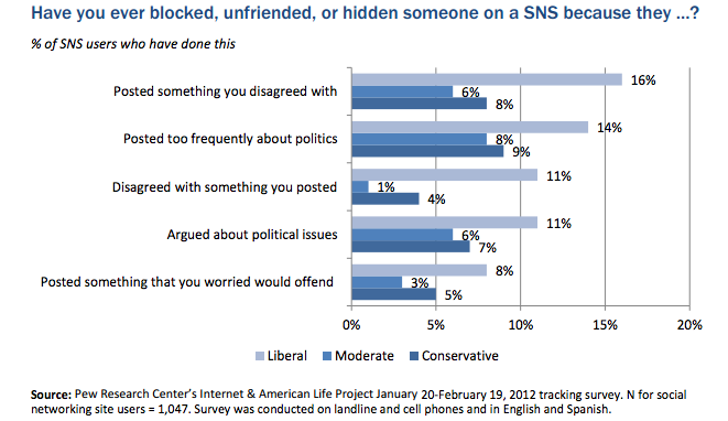 The above chart is from a recent Pew report (pdf) that found 18% of social networking site users have decided to block, unfriend or hide someone because of their politics or posting activities. More on the rise and fall of online empires here.