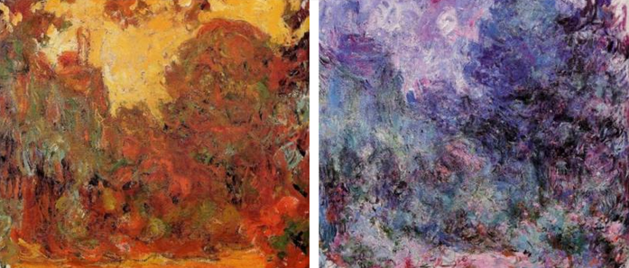 The paintings above are of the same scene. The red and yellow version is painted as seen through his left eye, limited to the wavelengths allowed by his cataract. The painting on the right is deep blue and violet, as seen through an eye with no lens. Who can imagine how those colors appeared to his eye while being mixed on his palette?